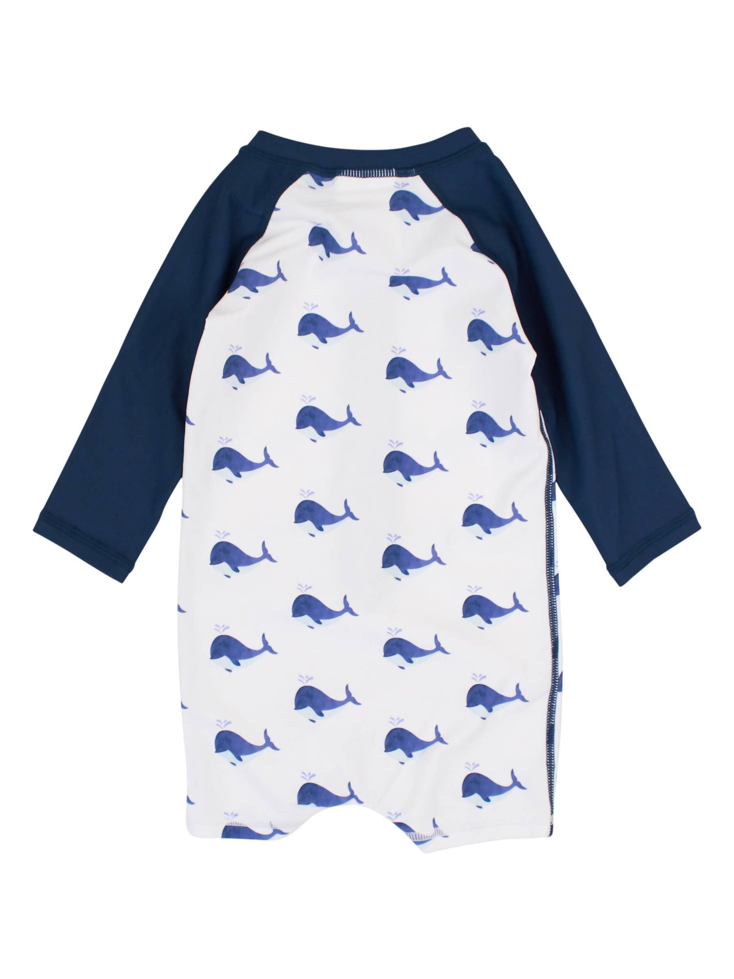 Keep your little guy safe from the sun with this UPF 50+ Boys Long Sleeve One Piece Rash Guard. This full coverage one piece suit makes trips to the pool, lake or beach so easy for little crawlers. Snaps at bottom make for easy changing. Made with sun protected fabric for all day protection and comfort.