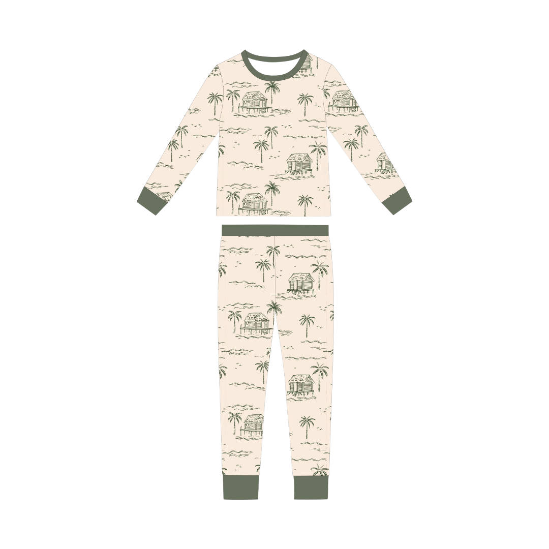 Introducing our Beach Bungalow Bamboo Pajamas, crafted with premium bamboo material that is soft and comfortable to the touch. These pajamas are perfect for your little one's bedtime routine, providing a cozy and breathable fit for a peaceful sleep. The simple beach design is the perfect addition to your baby's wardrobe. With easy two piece design made perfectly for your growing toddler.