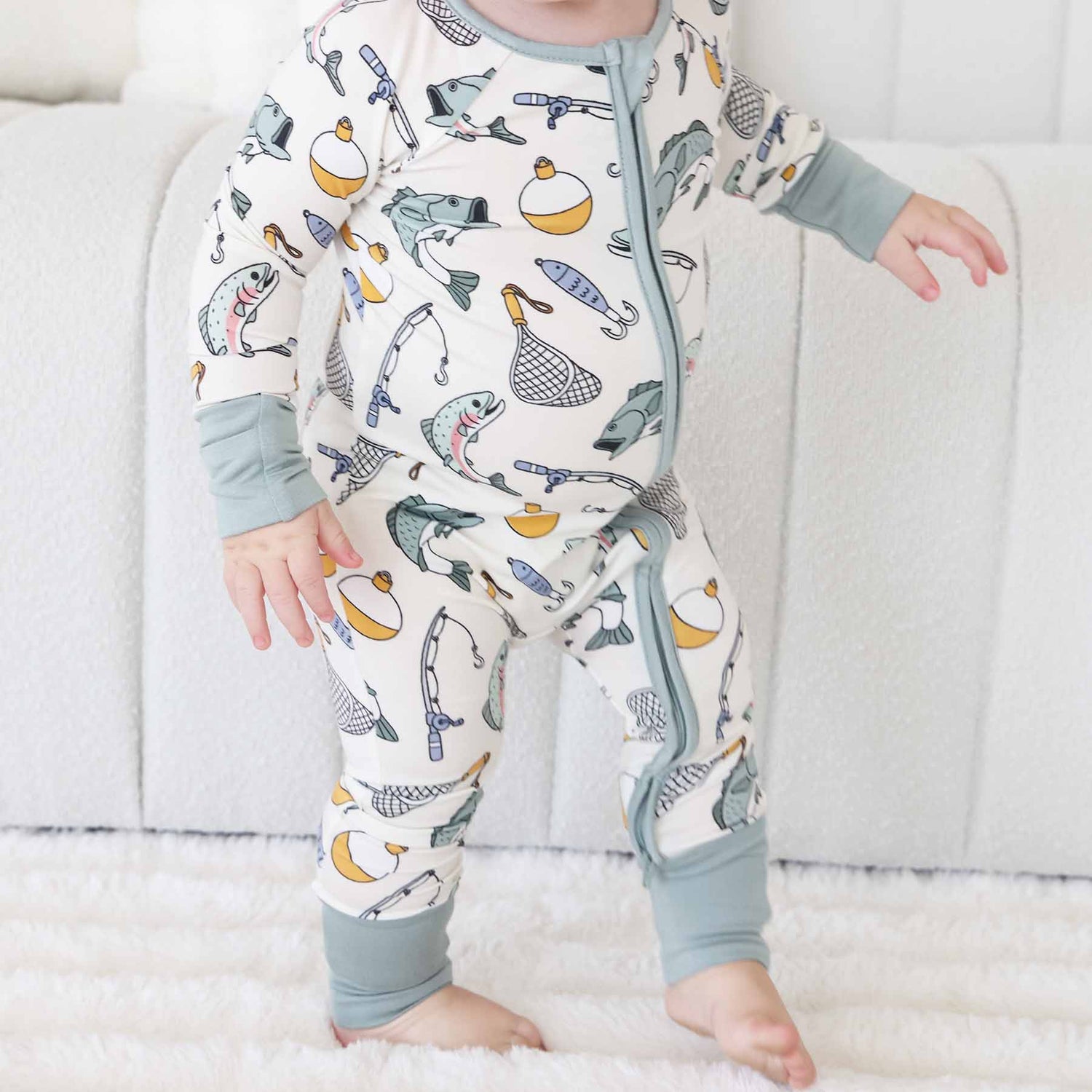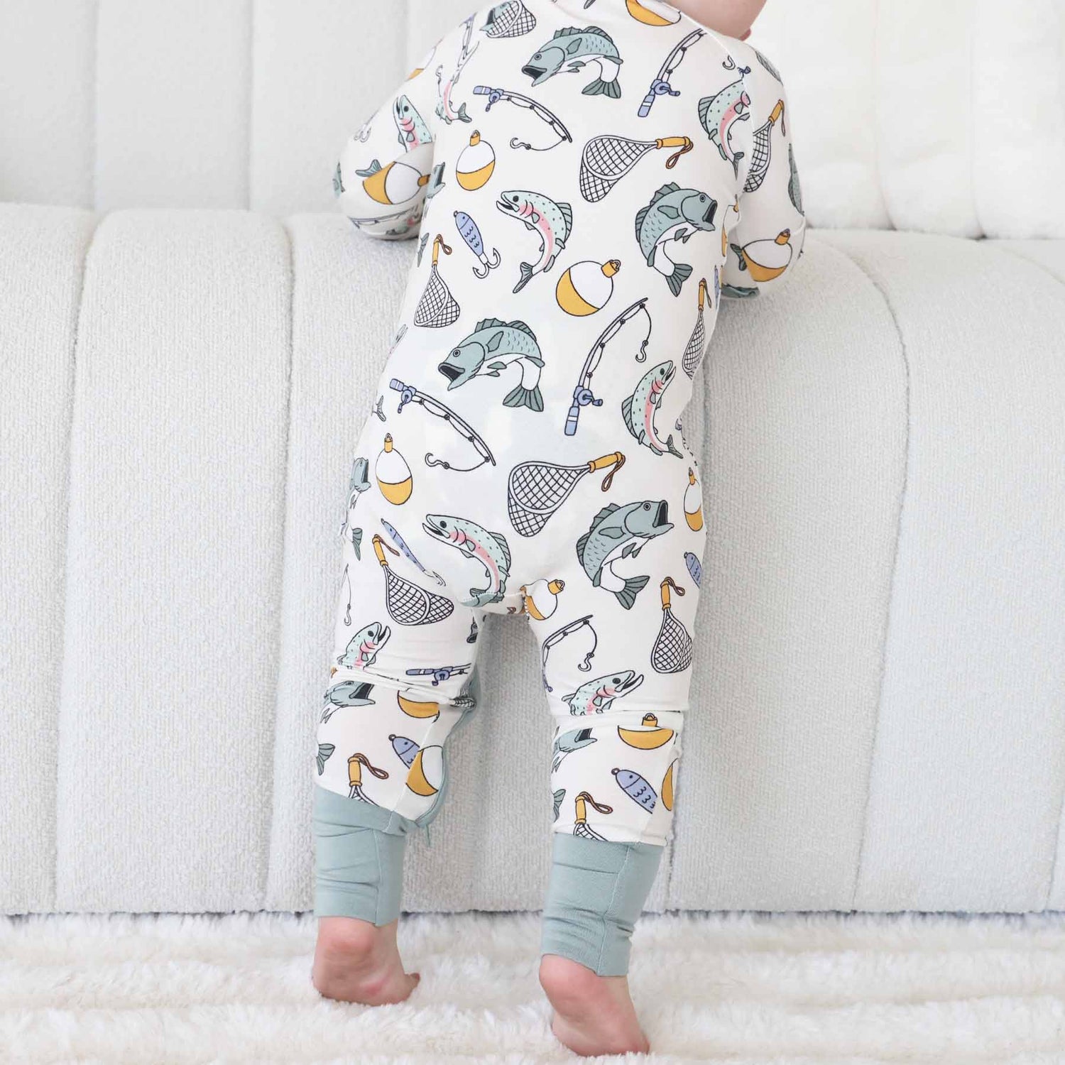 Made from luxuriously soft and breathable bamboo viscose, this fishing-themed romper is perfect for babies and toddlers who love to lounge, play, and sleep in cozy style. Featuring our adorable Catch of the Day print full of friendly bass, bobbers, and lakeside charm, this one-piece pajama romper is a must-have for mini outdoor enthusiasts. Designed with convenience in mind, this romper features a two-way zipper for quick diaper changes and convertible footies that let you switch from footless to footed in seconds. Built-in flip mitts help protect tiny faces from scratches, while the stretchy bamboo fabric ensures a comfy fit that moves with your little one.