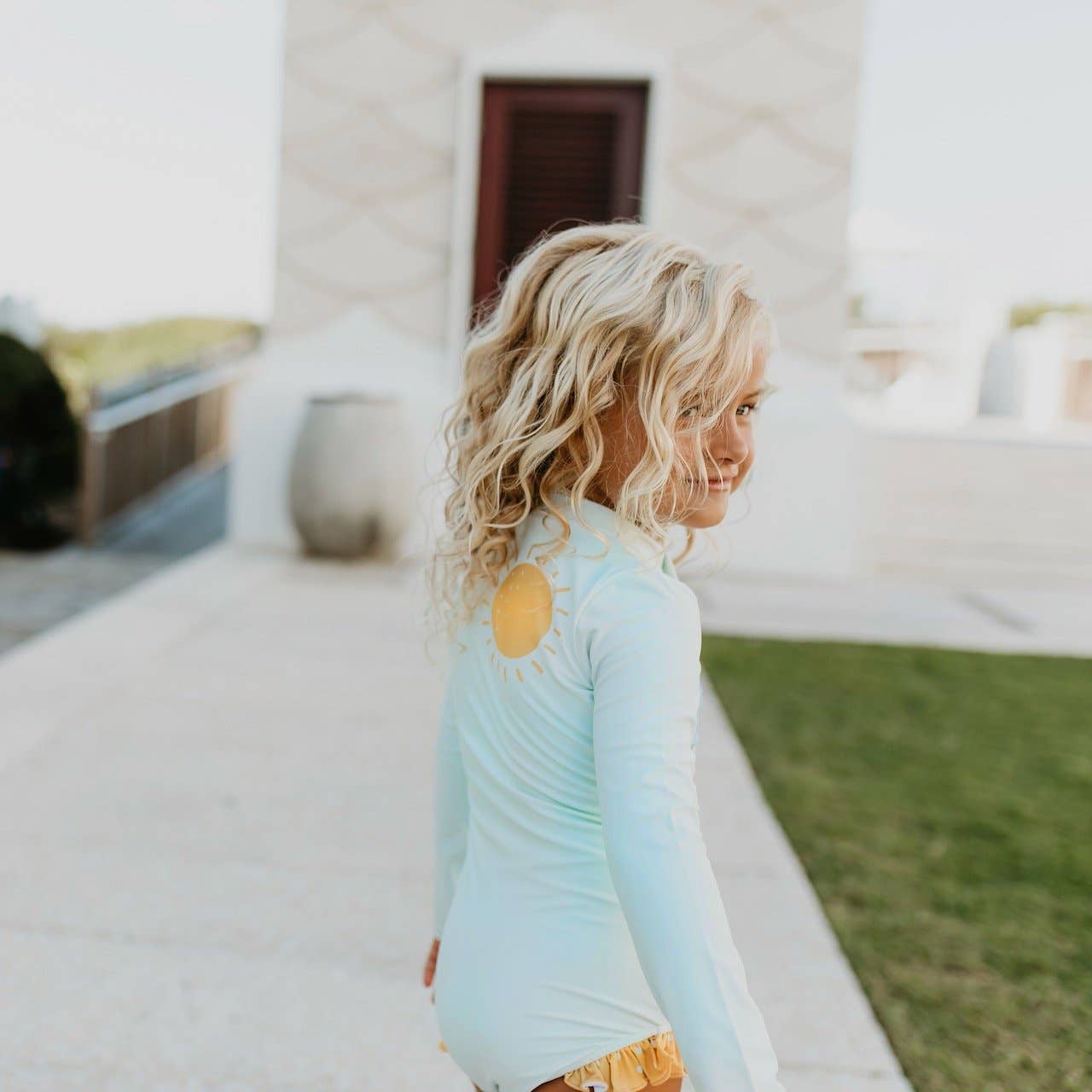 Girls teal Mint & rainbow print long sleeve one-piece zip up rash guard with mustard ruffle details. SPF 50. Double lined throughout. High quality. Perfect for spring & summer swims! Sizes 12 months- 2T have snaps for easy diaper changes. Wash on gentle cycle cold wash, hang dry.
