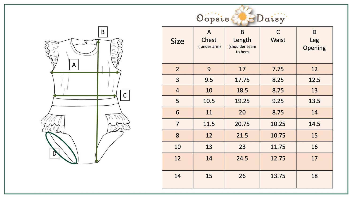 Girls cream, coral, and olive tropical leaf print open back one piece swimsuit with polka dot ruffle accents. SPF 50. Double Lined Throughout. High quality FULL Ruffles! Perfect for spring & summer swims! Fade resistant for multiple seasons of wear. Bottoms are made modest for full coverage with good elastic in legs that will not loosen over time.