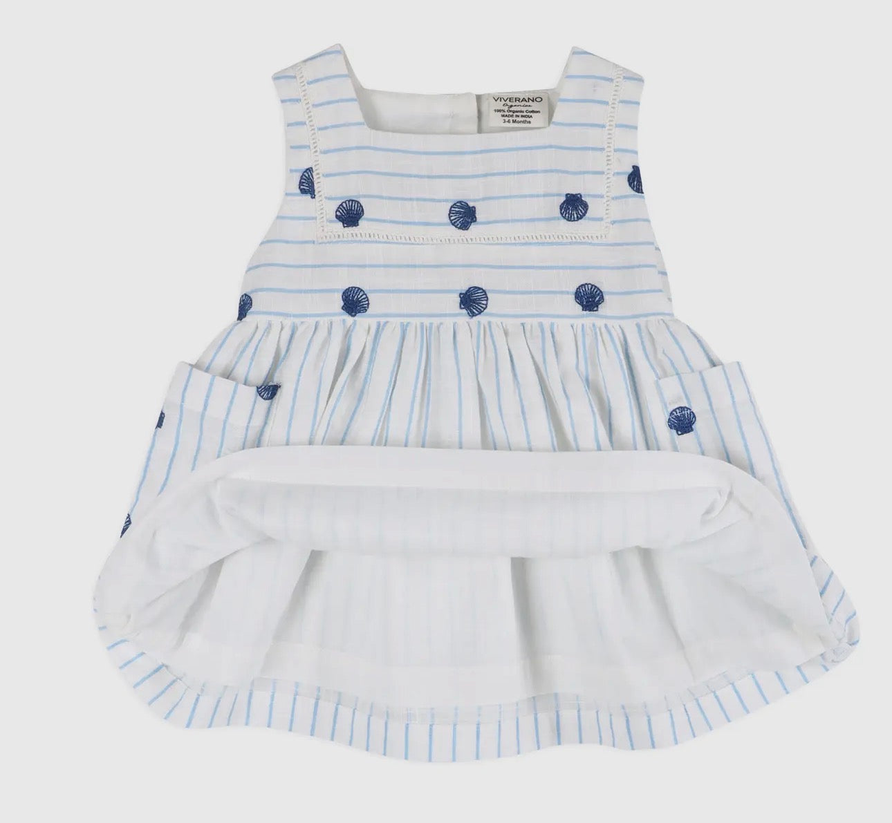 Organic Cotton Dress- Embroidered Seashell Stripe