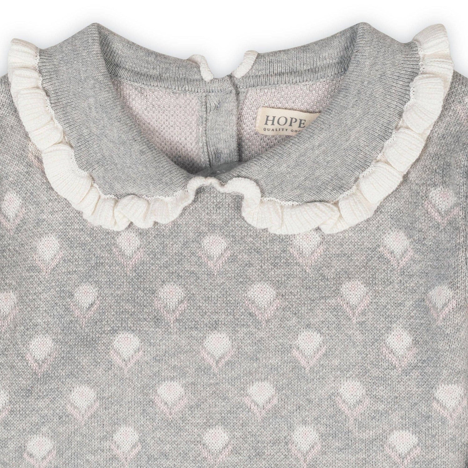 A standout of the season is our peter pan collar sweater crafted from soft organic cotton. Features feminine bell shaped sleeves, a knit peter pan collar with ruffle detail, and a button closure at the back neck for easy on and off. This sophisticated piece pairs perfectly with our collection of organic cotton skirts and leggings.
