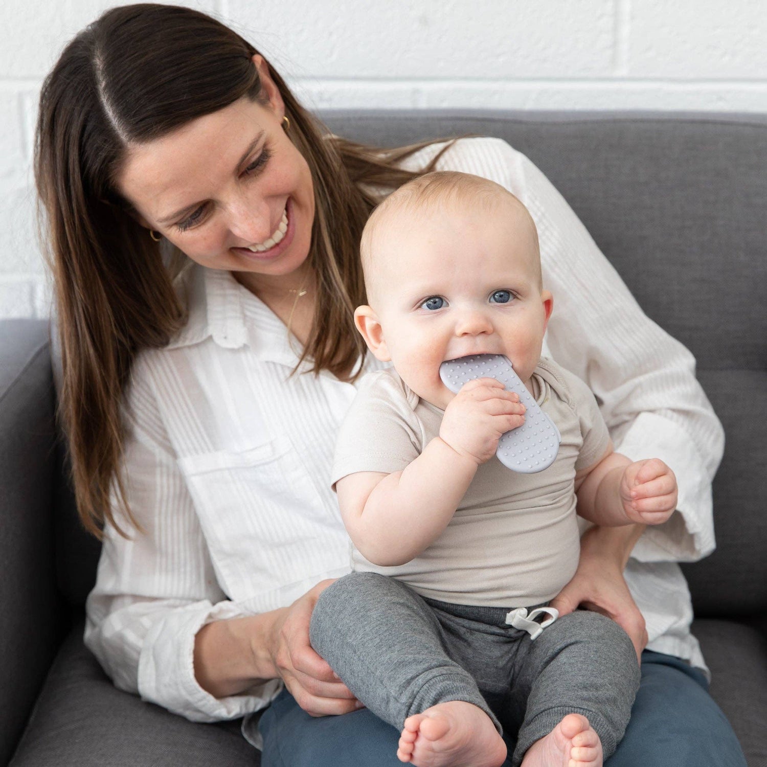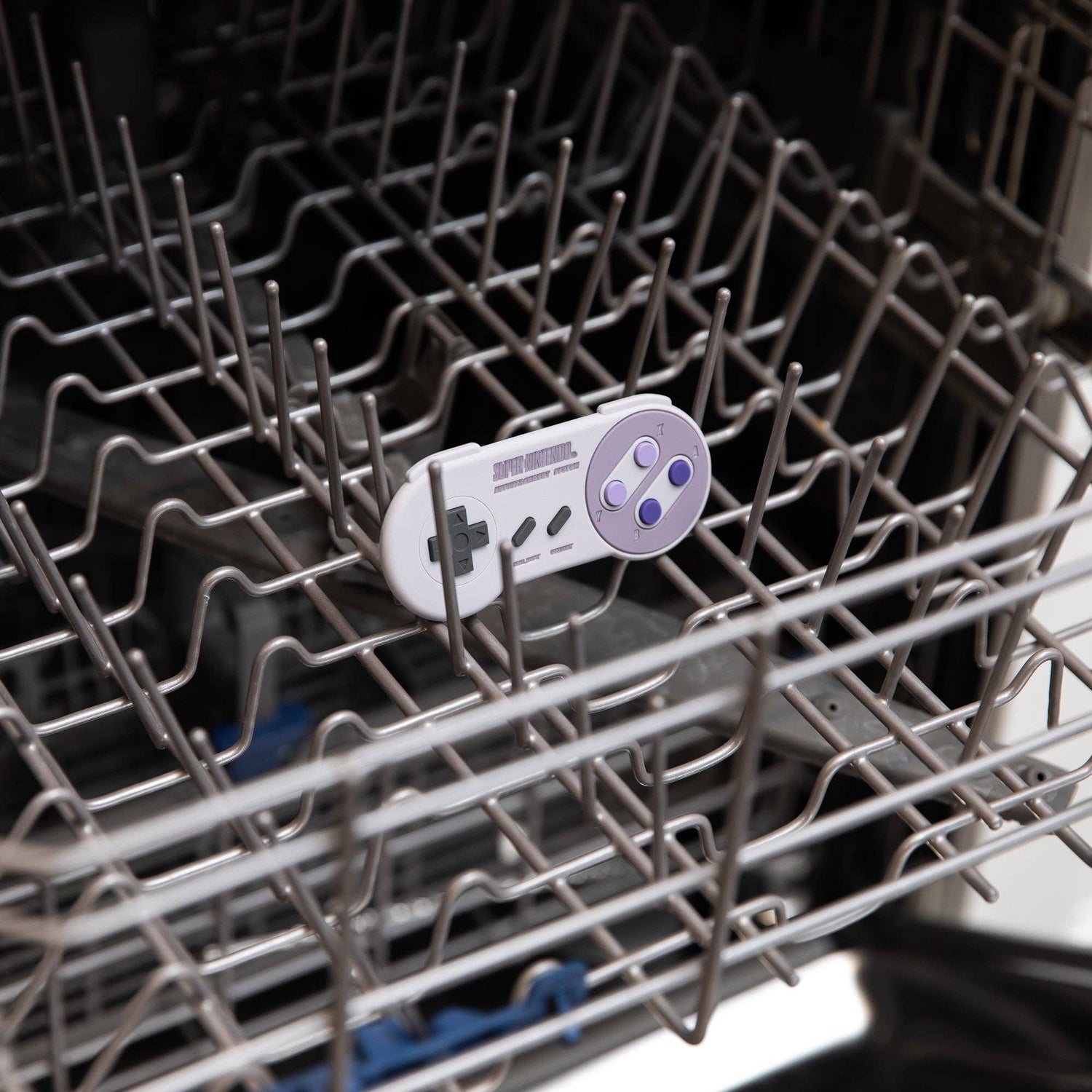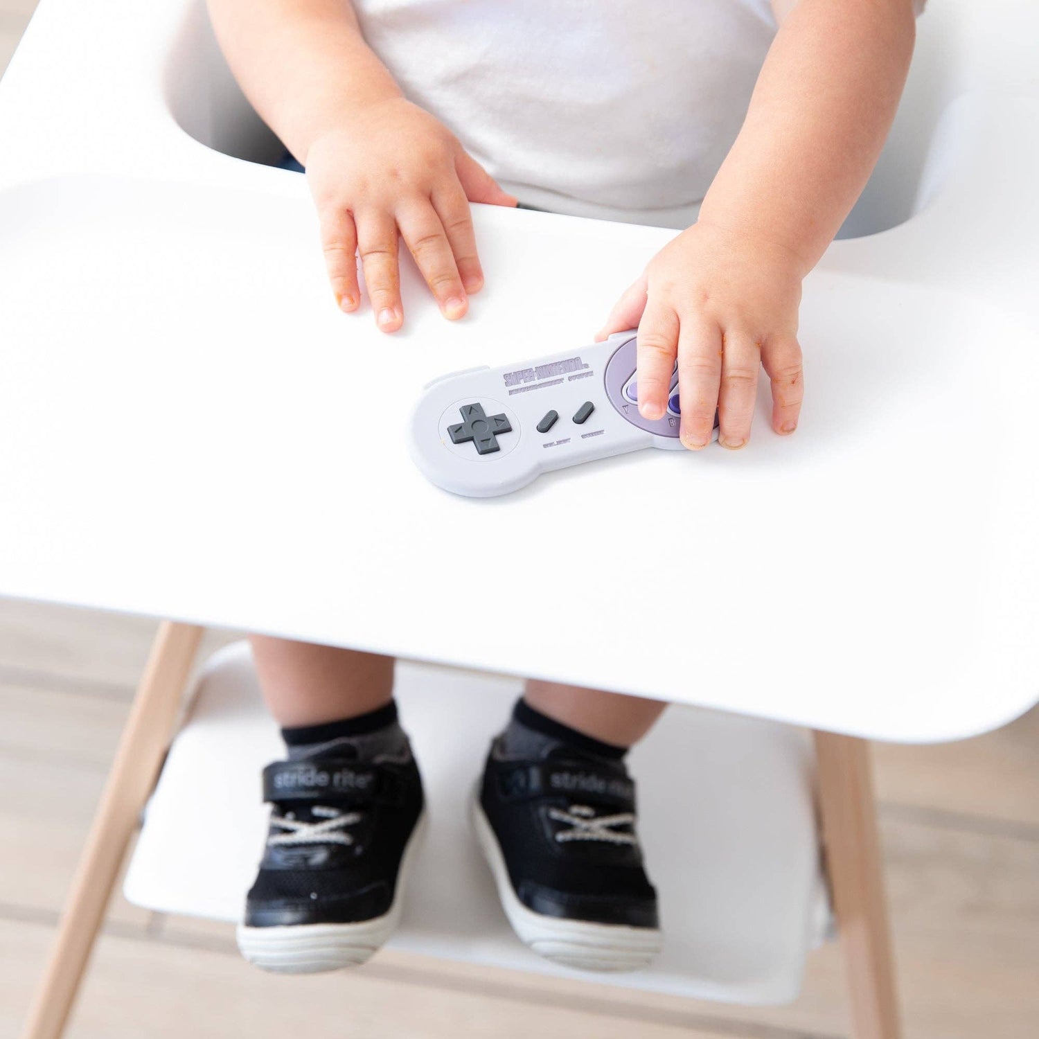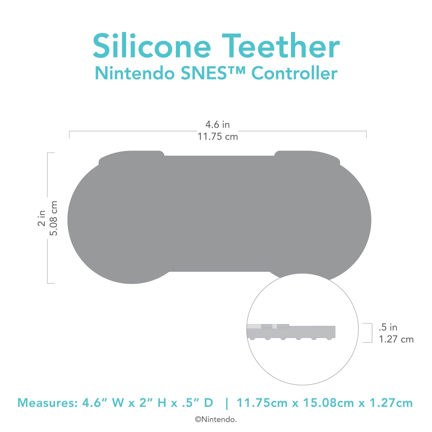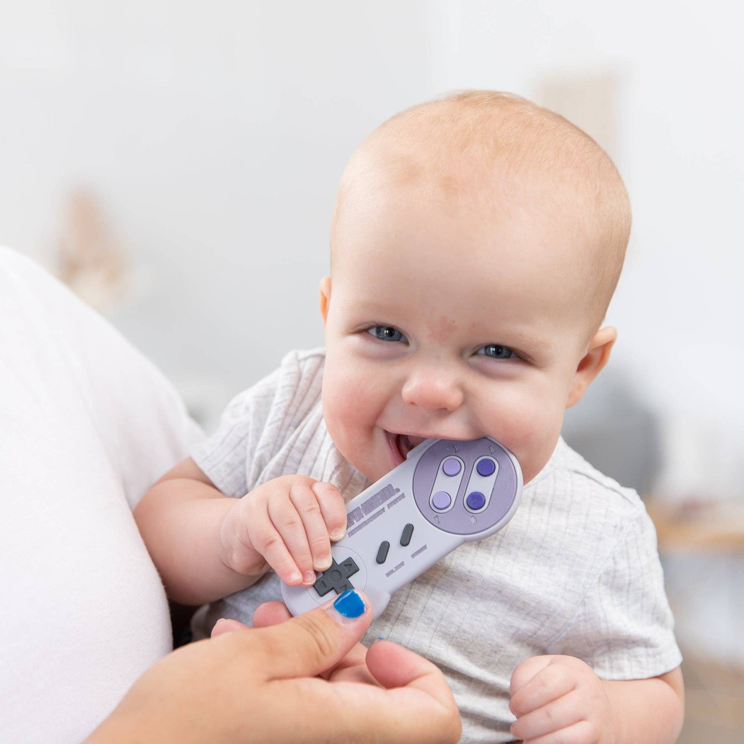 Inspired by Nintendo's SNES™ Controller, parents love the nostalgia of this teether designed for babies who are in the teething stages. Sized for little hands and mouths, this teether includes textures to help babies explore and chew safely. Silicone has a natural resistance to bacteria. It can be safely boiled to sterilize.